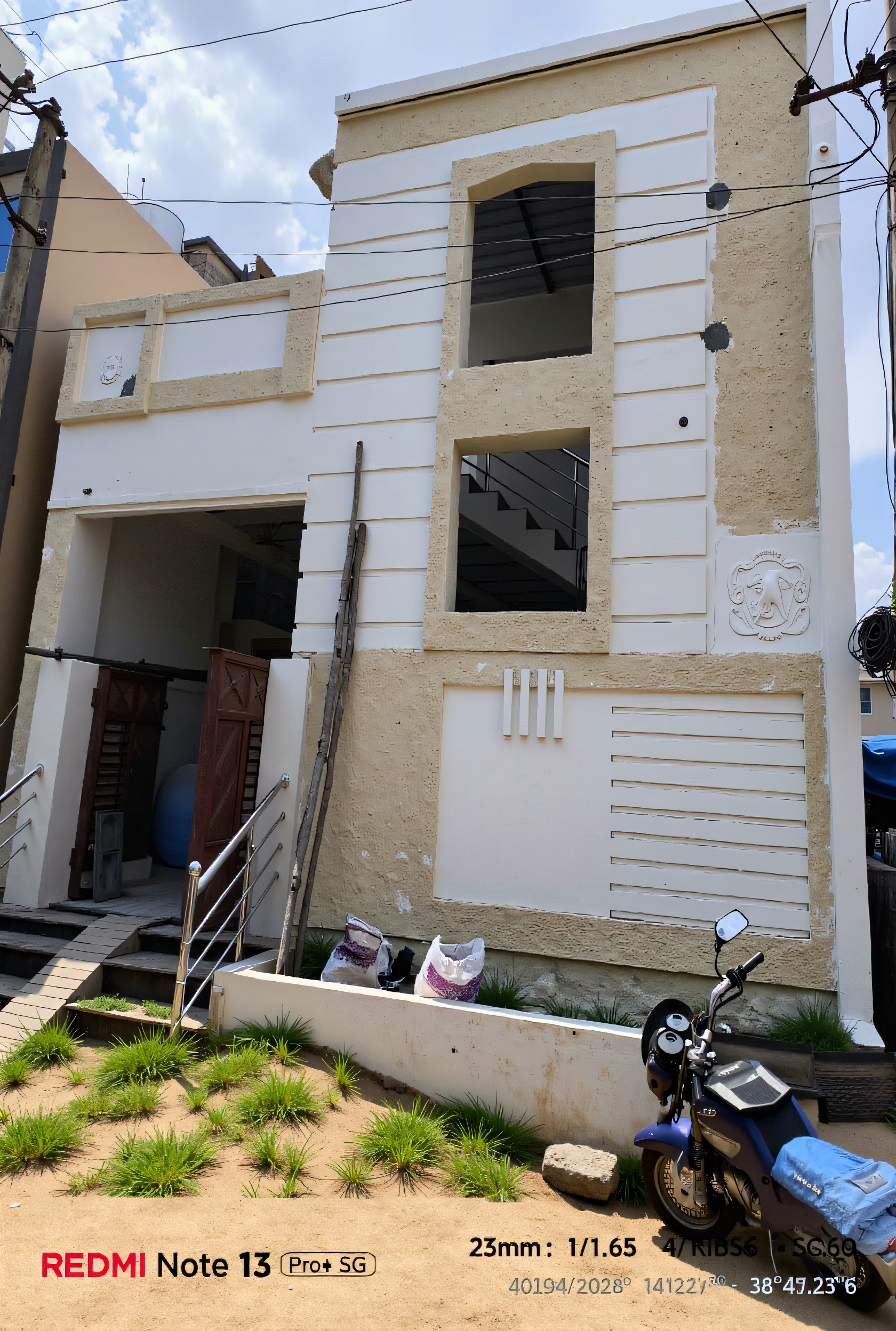 Building, A home exterior painted with a mid buff, stone path , Polka 7869 , vine yard 7809 and White colour combination