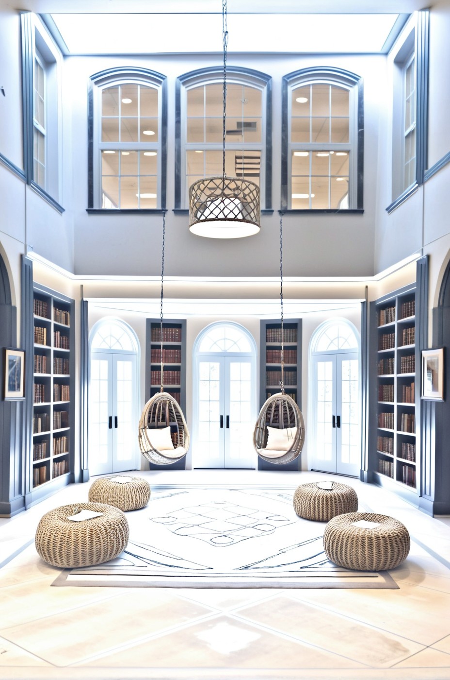A high-resolution photograph of Library/Study, , ROUND THE WALLS OUT IT IS A CIRCULAR ROOM AND CEILING. ADD STAINED BEIGE CONCRETE FLOORS AND A RUG. SOME KIDS CHAIRS AND HANGING SWINGS 22 FEET ACROSS AND A 15 FOOT OPENING. SHOW FROM OUTSIDE THE ROOM LOOKING IN