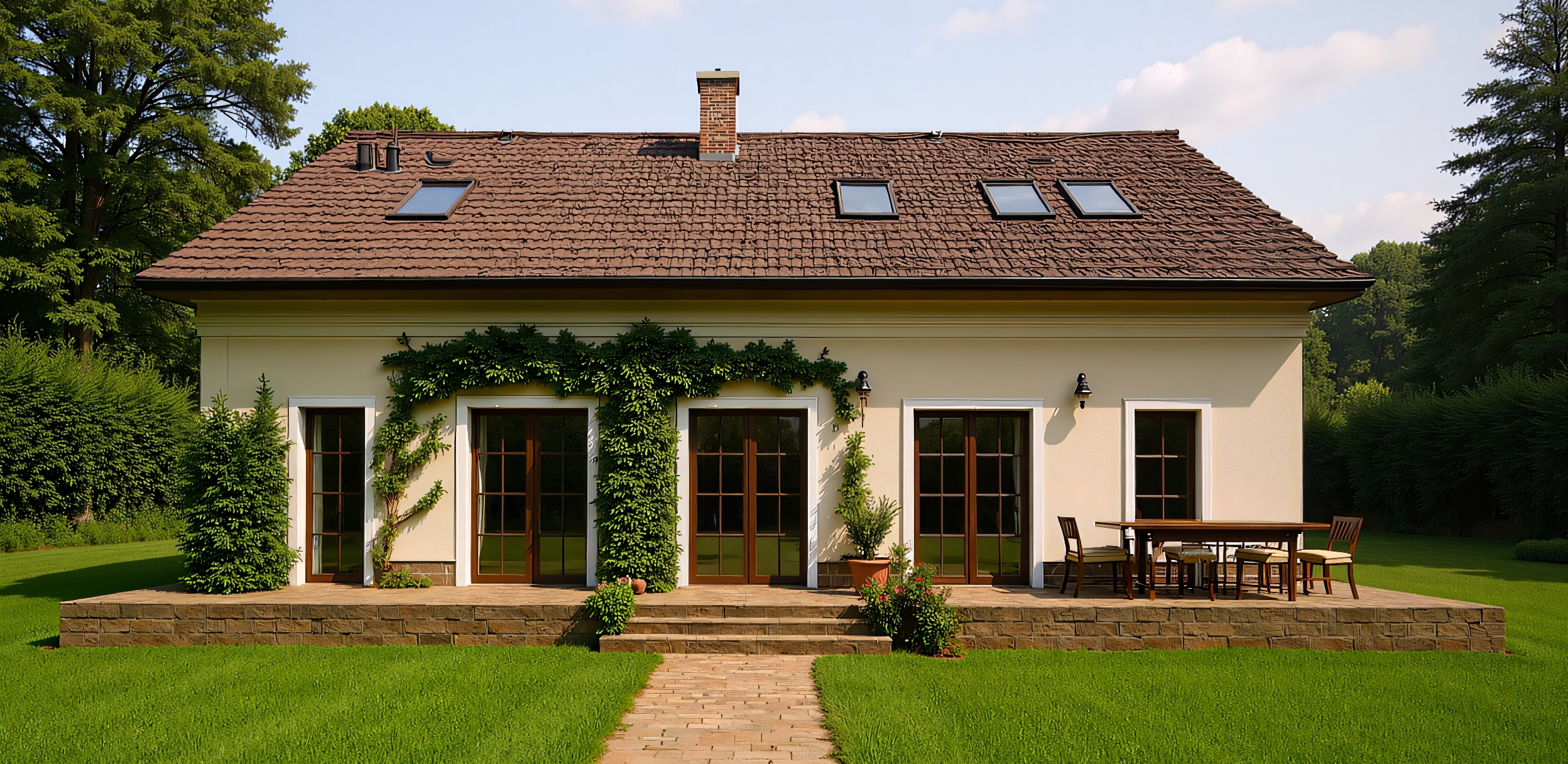 Building, orealistyczna wizualizacja małego klasycznego dworku w stylu polskim, jasnobeżowa elewacja, dach pokryty brązową dachówką typu karpiówka, przed domem bujna zieleń, zadbany ogród z krzewami i trawnikiem. Na scianach pnące się latorośle winorośli. Światło dzienne, naturalne cienie, realistyczne detale materiałów, wysoka rozdzielczość jak zdjęcie. dodaj odbicia z oknach. Przed domem taras w kolorach kamienia brązowego i stół z krzesłami.