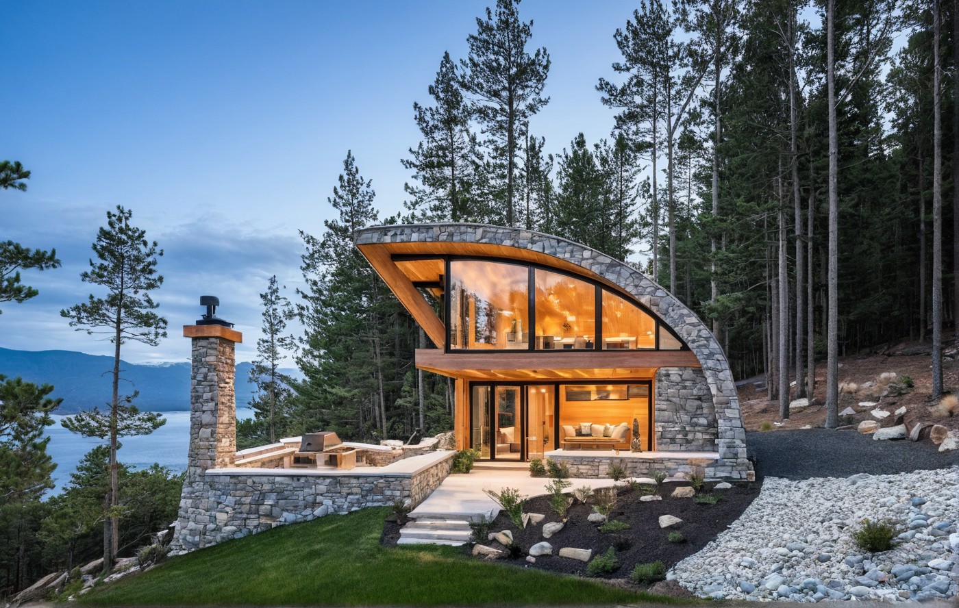 Visualize a contemporary mountain cabin, nestled deep within a serene forest landscape. This architectural concept features a striking combination of natural stone and rustic shake siding, creating a harmonious blend with its mountainous surroundings. ArchiVinci's AI exterior rendering service transforms initial sketches into photorealistic visualizations, perfect for exploring design ideas rapidly. The compact, modern form maximizes the connection to nature while offering a cozy retreat. Ideal for architects and designers seeking to develop unique cabin designs, this visualization demonstrates how innovative materials and thoughtful design can create stunning residential structures. Explore different design iterations and bring your mountain dream home to life with ArchiVinci.