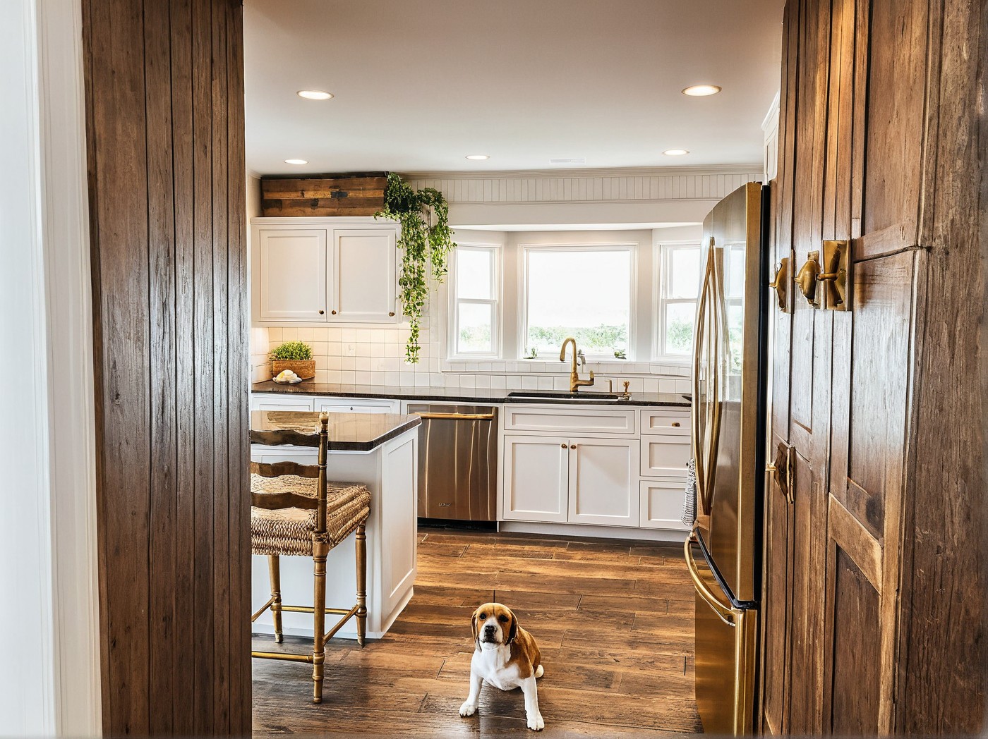 Kitchen, Make the window go from counter to ceiling, add farmhouse sink, make the cabinets go to the ceiling and stain them a warm brown tone, add antique brass handles and knobs, taj mahal quartz counter