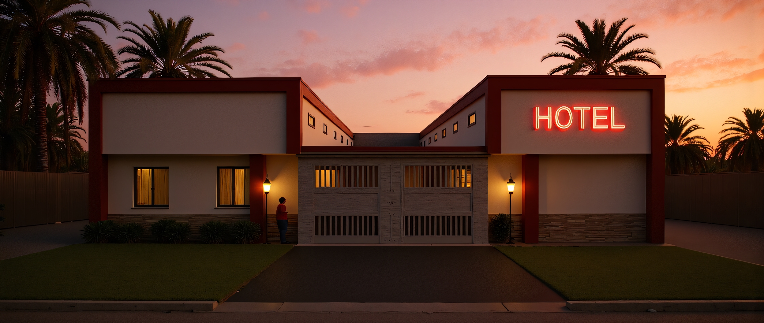 Hotel, Cozy motel with a simple facade in cherry and light grey colors. Some palm trees in front, spot lights on the walls and neon lights that make the auctions.