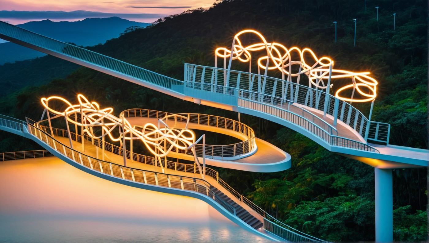 Bridge, vehicular and pathway in a bridge, metalic white rails, inclined lighting poles with warm led strip light like clouds, vegetation, tropical forest, sunset time, curved hose lights