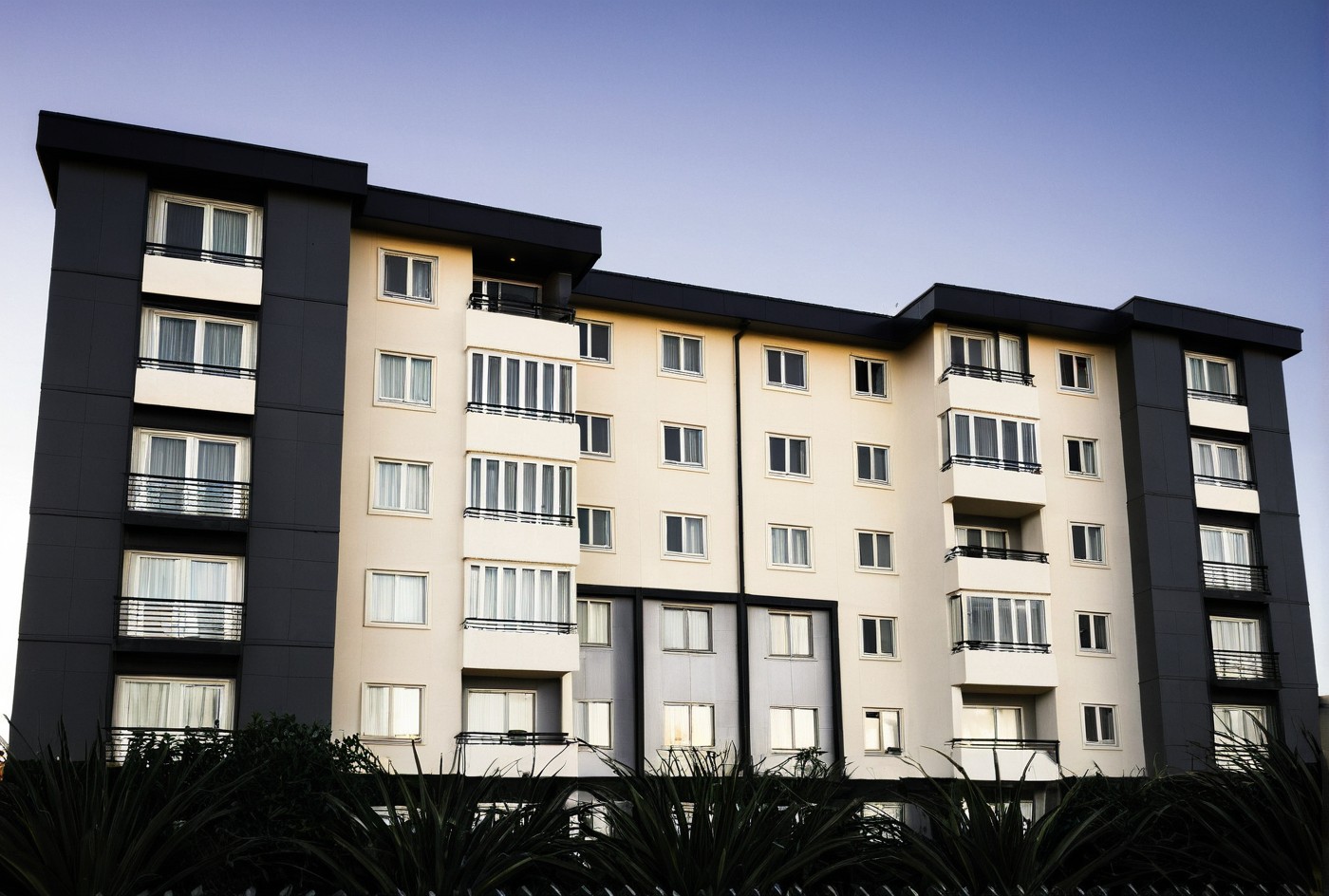 Apartment Building, Paint the building in dark gray, cream and white colors.