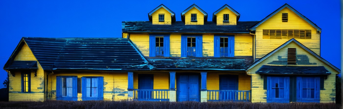 Residential House, haunted mansion, inhospitabel, with mansard roof, aged stonework, broken shutters, ghostly blue lighting, yellow window trimming, peeling paint, broken boards