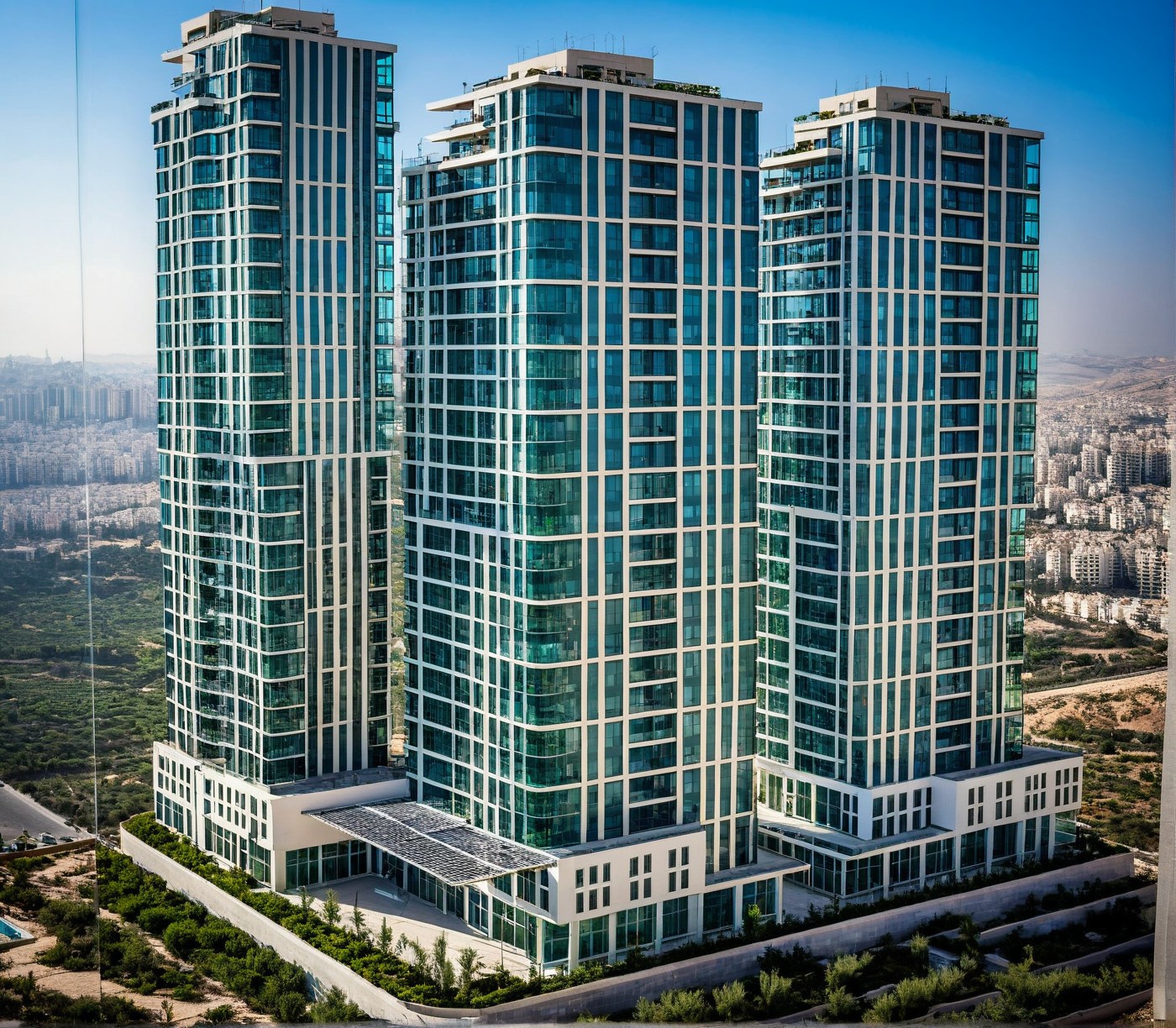 This prompt outlines a striking high-rise residential and mixed-use complex designed for the vibrant heart of an Israeli city. Envision slender, modern towers characterized by clean vertical lines, expansive glass balconies, and minimalist façades that blend light and dark tones. The ground level pulses with urban energy, featuring transparent commercial spaces with full-height glass, bustling pedestrian activity, and vehicles, capturing the essence of a dense urban center. Integrated greenery, including façade-mounted plants, rooftop terraces, and landscaped street-level areas, softens the architecture and enhances the environment. This design concept offers a sophisticated blend of contemporary architecture and urban vitality, ideal for creating iconic city landmarks.