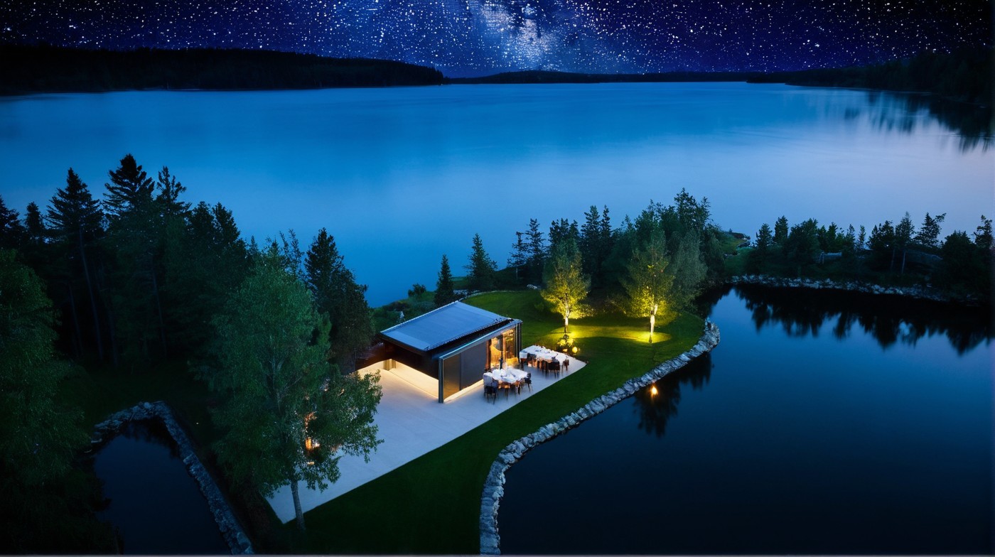 Restaurant, Restaurant next to a lake on a starry night and surrounded by a small, not very leafy forest