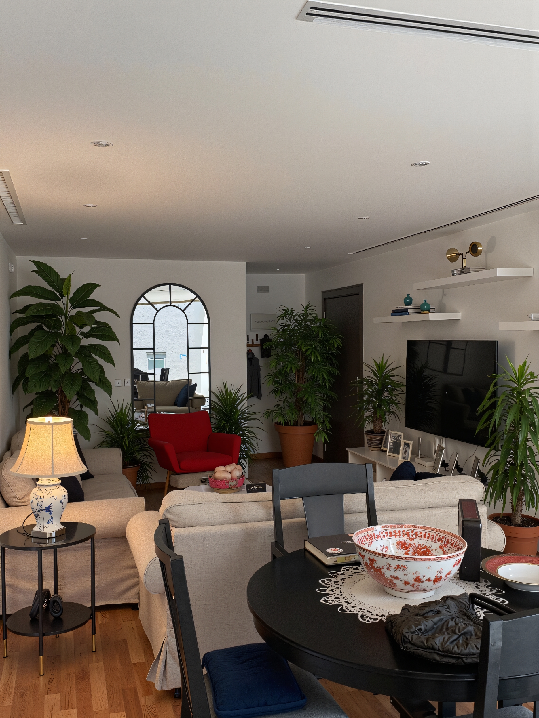 Living Room, I want to add plants, a stand lamp, cusions that match the space and maybe even change the dining table... how can I enhance this space? Can you add a different chair as well? Funky one?