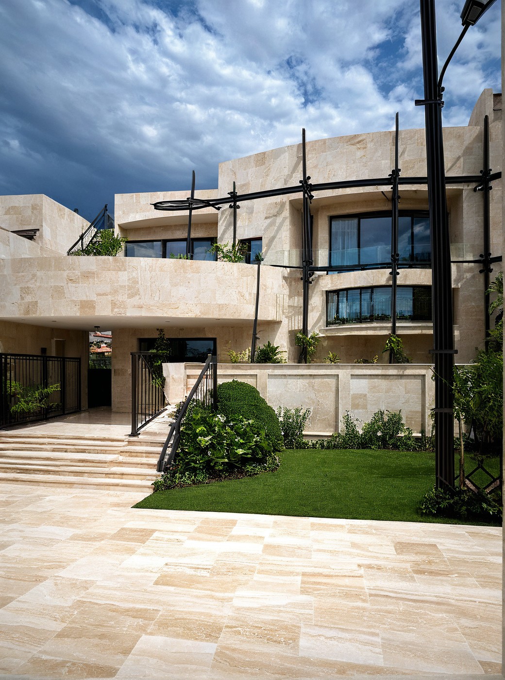 Elevate your residential house exterior with a sophisticated travertine marble tile renovation. This ArchiVinci rendering showcases a modern home design enhanced by the natural beauty and timeless appeal of travertine. The design incorporates integrated lighting features to highlight the architectural details and create a warm ambiance. Frameless glass terrace railings provide unobstructed views and a sleek, contemporary aesthetic. Our AI-powered exterior rendering service allows you to visualize these dramatic changes quickly and accurately, ensuring your vision for a luxurious and updated home is realized. Perfect for homeowners and architects seeking to redefine their property's facade with premium materials and modern design elements.