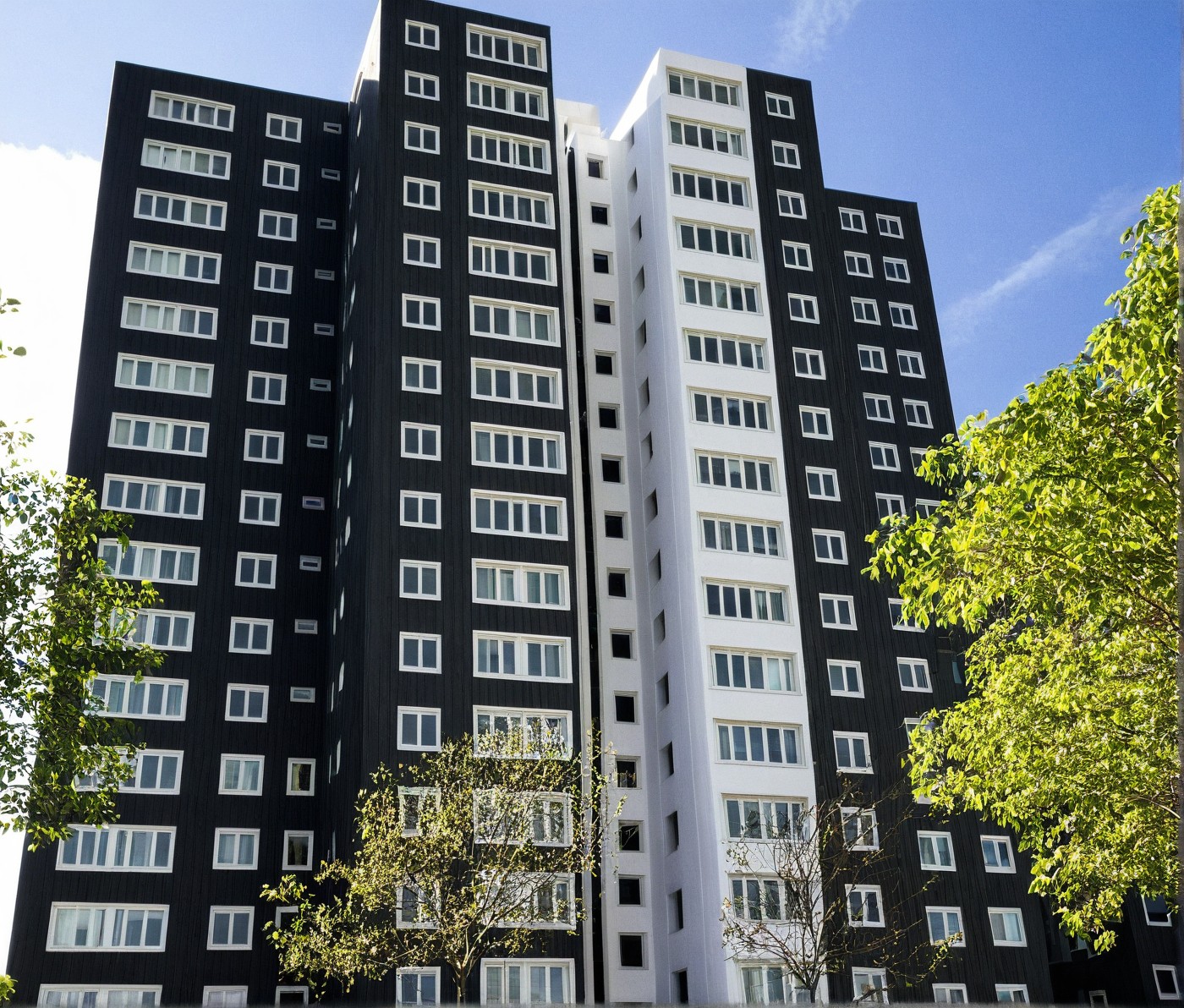 Apartment Building, Paint the building in anthracite, khaki and white colors.