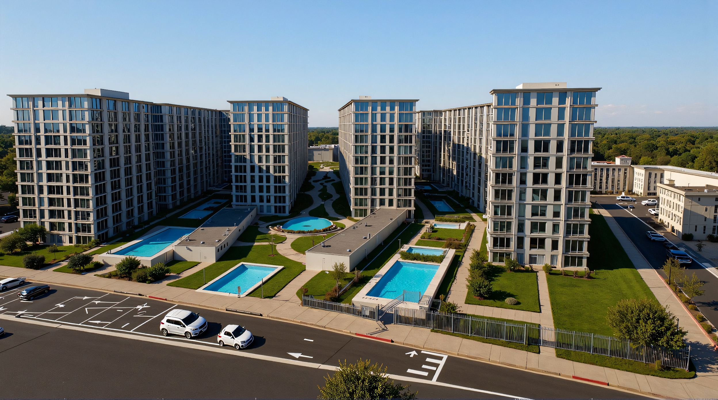 Apartment Building, High-quality photorealistic render of a modern residential apartment complex, realistic sunlight and shadows, landscaped gardens, swimming pools between buildings, based on uploaded image