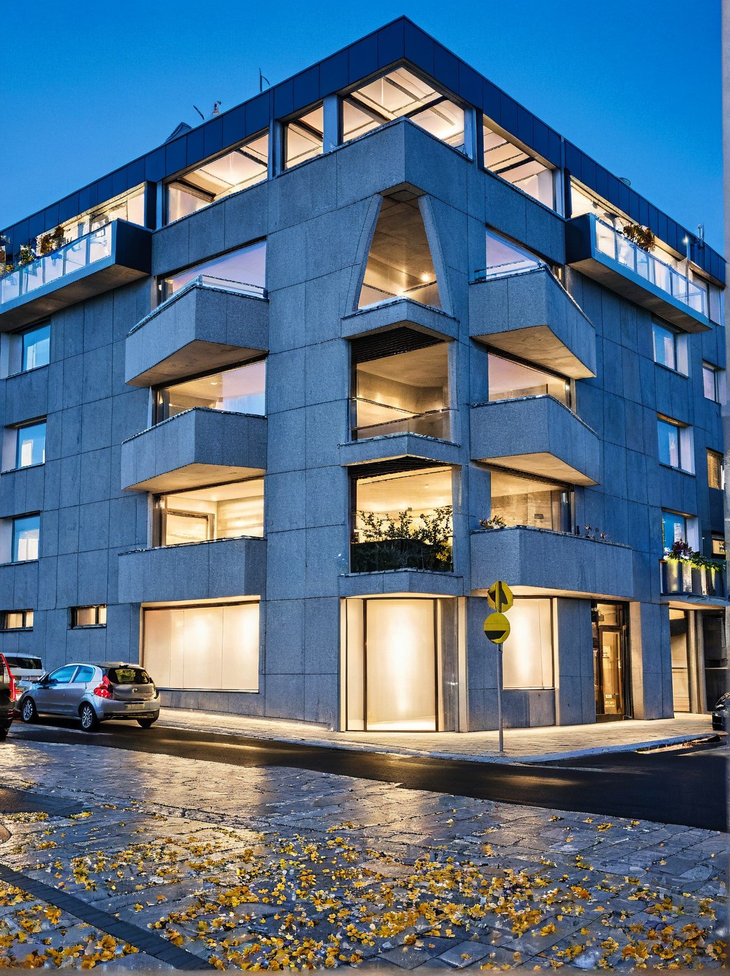 A high-resolution photograph of Apartment Building, , palazzo moderno rivestito in pierta chiara, lastre grandi, inserisci vetrate a piano terra, mantieni l'asfalto su strada
