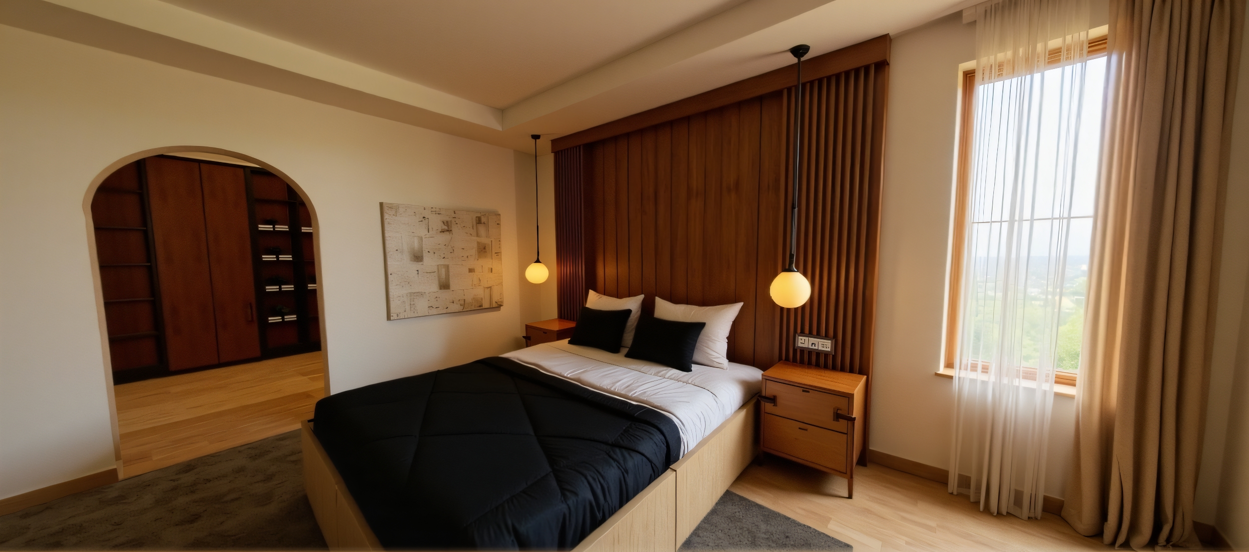Bedroom, Maintaining the colors and materials, keep the headboard a beige fabric background with a beige wood alternative on the sides.