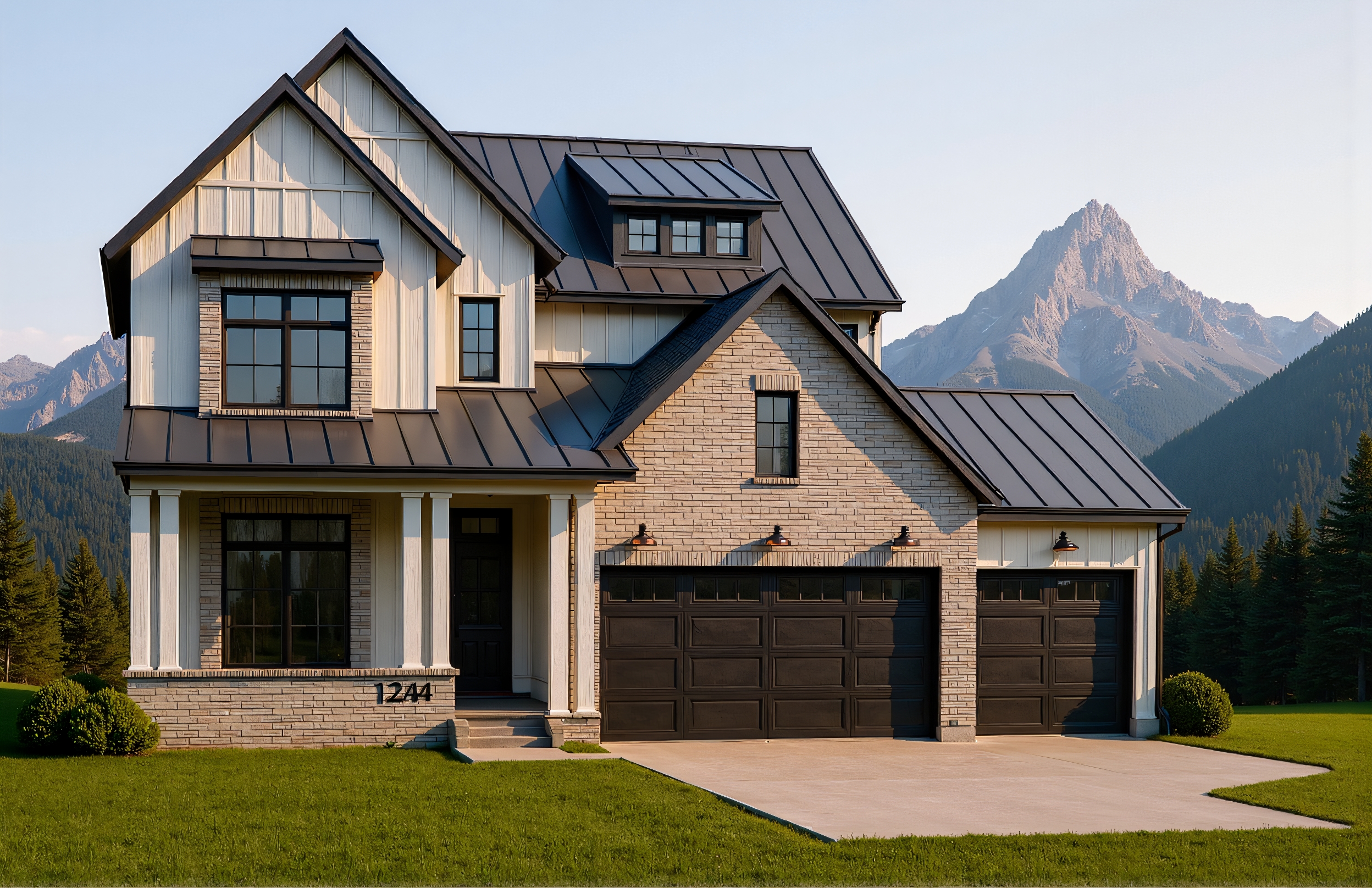 Discover this striking modern farmhouse, rendered in a sophisticated black and white palette. Characterized by its very sleek and contemporary aesthetic, the design features prominent black metal shed roofs that define its silhouette. The architectural columns are notably minimalist, free of any trim for an ultra-modern look. Set against a backdrop of majestic mountains within a neighborhood context, this exterior visualization showcases ArchiVinci's ability to generate detailed 3D models of residential houses. Ideal for exploring cutting-edge architectural styles, this design emphasizes clean lines and a bold, monochromatic scheme, perfect for those seeking a distinctive and highly modern home.
