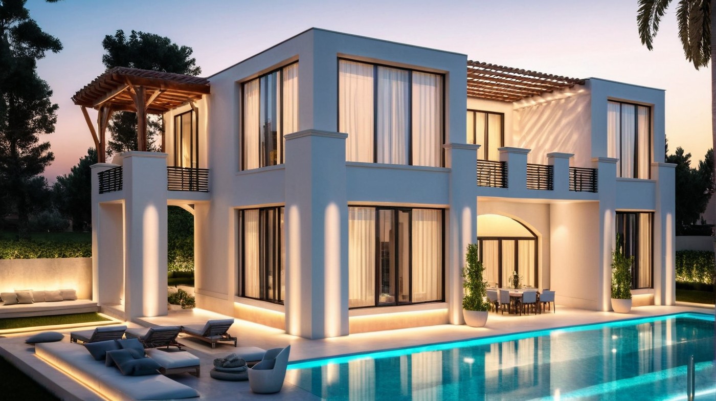 Experience the refined elegance of a modern-classical duplex villa designed for the Lebanese landscape. This architectural visualization showcases a harmonious blend of classic symmetry with contemporary materials, featuring crisp white and sophisticated slate-gray facades. Expansive openings and glass railings invite abundant natural light, blurring the lines between indoor and outdoor living. The design includes a private swimming pool and a stylish terrace lounge, complemented by lush Mediterranean landscaping that evokes a sense of tranquility. ArchiVinci's AI rendering brings this vision to life, emphasizing warm sunlight, realistic shadows, and serene evening tones. Explore how modern design principles meet timeless aesthetics for ultimate comfort and beauty.