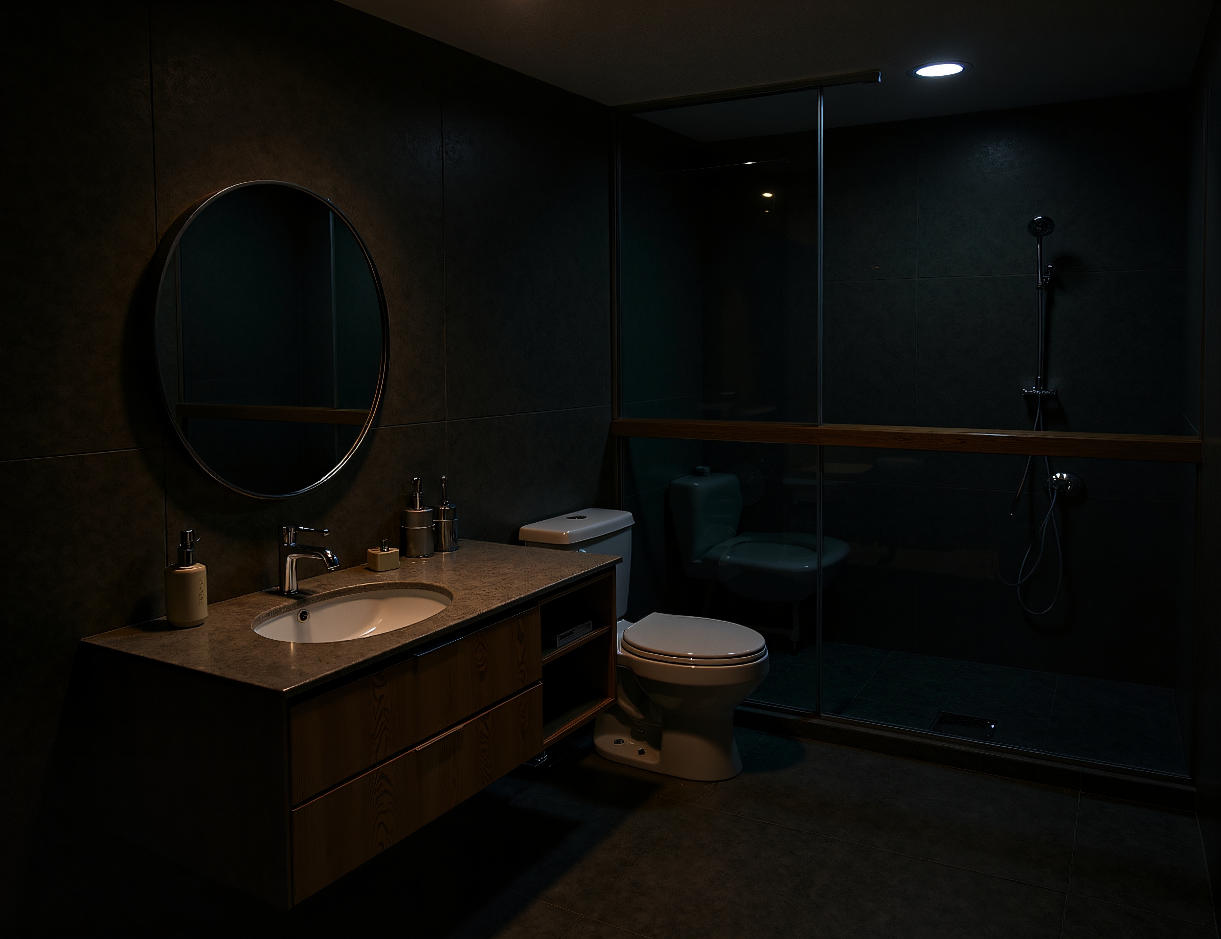 ArchiVinci presents a stunning modern dark bathroom, expertly rendered from a 3D model. This design emphasizes dramatic dark wall paint, complemented by carefully selected, suitable wall materials to enhance the sophisticated aesthetic. Maximized lighting ensures the space feels both luxurious and functional, preventing the dark tones from feeling oppressive. Essential bathroom equipment and premium fixtures are integrated seamlessly, showcasing a clean and contemporary look. Perfect for those seeking an elegant, moody, and highly realistic bathroom visualization, this ArchiVinci creation offers rapid iteration and high-fidelity results for your interior design projects. Explore the possibilities of advanced AI rendering for bathrooms that make a bold statement.