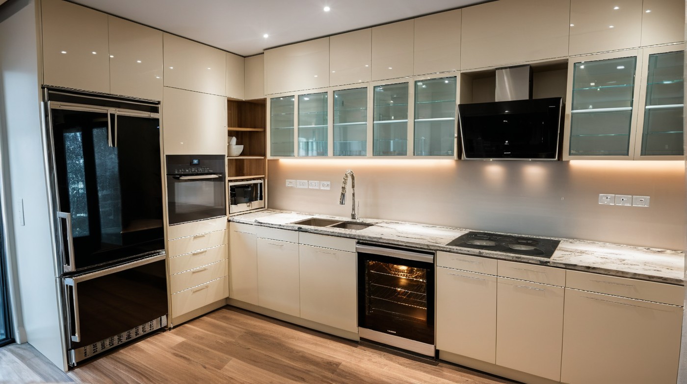 Kitchen, sağda ocak bulaşık makinesi evye solda buzdolabı fırın ve mikrodalga, üst dolapları komple cam olsun. koyu tema olsun