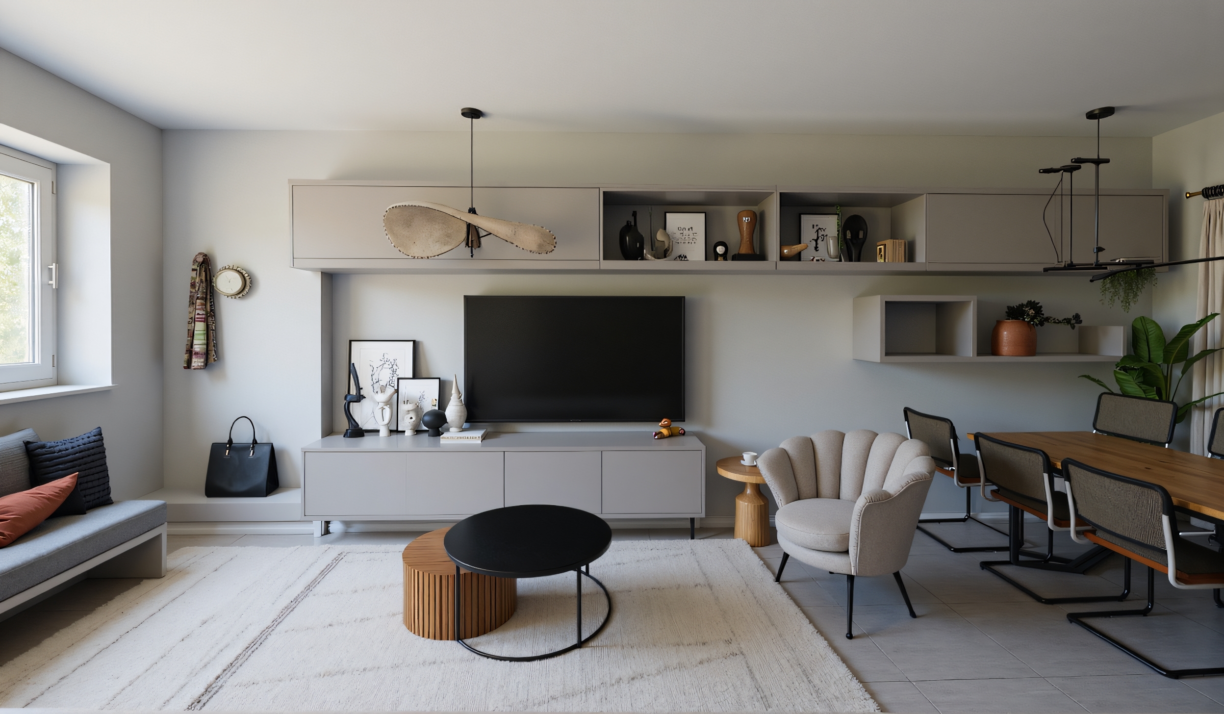 This photorealistic 3D model renders a bright and modern dining room, perfect for showcasing design concepts. The space features elegant, light grey tiled flooring that enhances the sense of openness. A key design element is the suspended furniture, with its underside in a sophisticated grey and the main body in a warm beige, creating a visually appealing contrast. The prompt emphasizes ample natural light, ensuring the dining area feels inviting and airy. This detailed interior visualization is ideal for architects and designers to present client-ready concepts, explore furniture arrangements, and refine material selections rapidly. ArchiVinci's technology allows for quick iterations, providing high-quality renderings that capture the desired aesthetic and functionality of contemporary dining spaces.