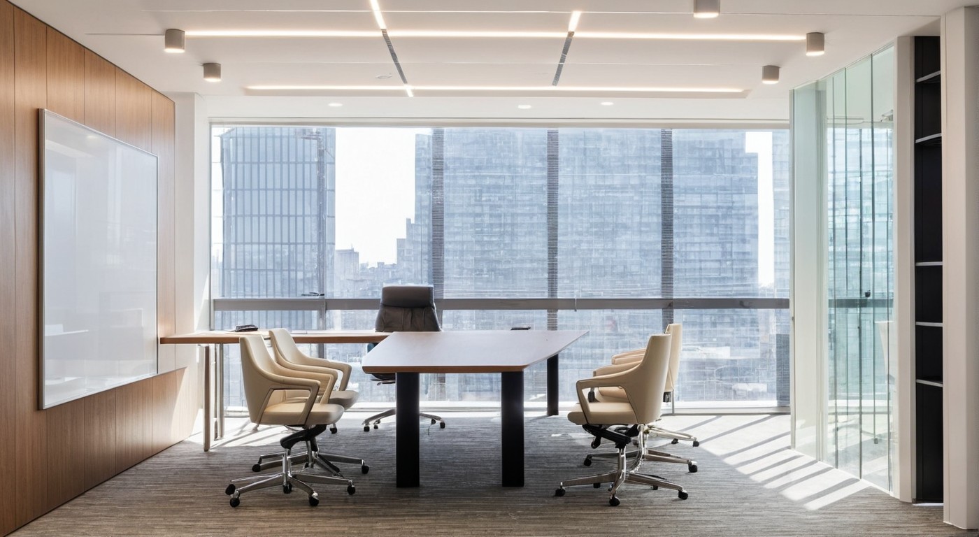 Office, Modern executive office, keep layout, ceiling, and city view unchanged. Desk in wood-metal mix, extending as meeting table, suggest modern form options. Walls stay same, only material changes. Light color palette, modern chairs, lighter sofas. Minimalist pendant above executive chair. Realistic lighting, 8K render, premium materials.