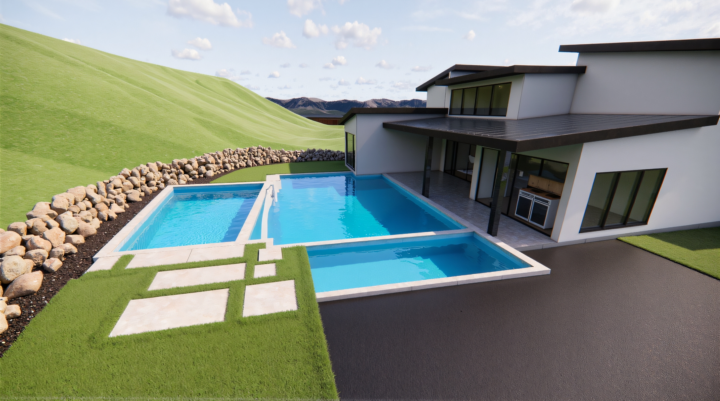 Transform your outdoor living space with this modern landscape design, perfect for ArchiVinci users seeking sophisticated garden renovations. Visualize a sleek pool and integrated hot tub complemented by essential features like an outdoor kitchen and a cozy fireplace. The design incorporates a functional retaining wall carved into a gentle hill on the right side, enhancing usability and aesthetics. Elegant stepping stones and a defined rock border add natural texture, while strategic outdoor lighting creates an inviting ambiance for evening enjoyment. This comprehensive plan includes a comfortable outdoor seating area, making it an ideal blueprint for creating a luxurious and functional backyard oasis. ArchiVinci excels in rapidly rendering these detailed landscape concepts, allowing for quick iterations and client approvals.