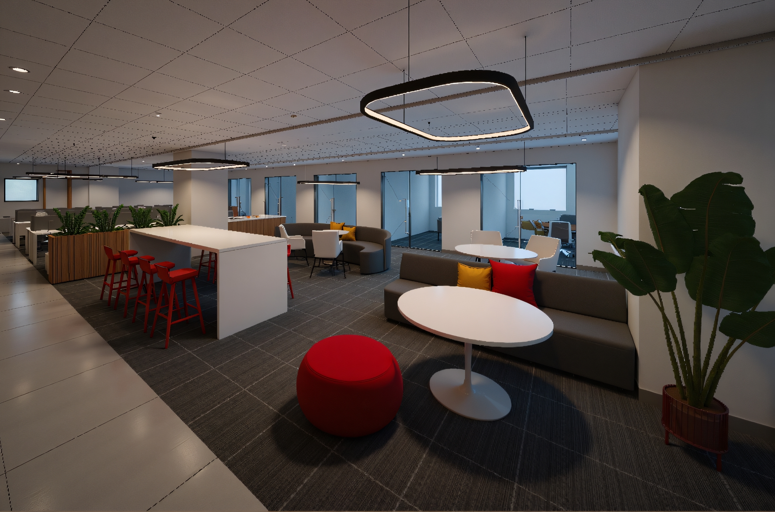 ArchiVinci presents a modern corporate open-plan office interior, rendered in a minimalist modernist style. This 3D model features distinct zones defined by flooring: a comfortable gray carpet covers the main working areas, while sleek, gray cement-look porcelain tiles delineate the primary corridor. The design emphasizes clean lines and functional aesthetics, creating a professional and productive environment. Ideal for businesses seeking contemporary office spaces, this visualization showcases how material choices can enhance spatial definition and overall ambiance. Utilize ArchiVinci's AI capabilities to rapidly generate and iterate on office designs, transforming your vision into photorealistic 3D models quickly and efficiently. Perfect for architectural firms, interior designers, and property developers looking to present innovative office concepts.