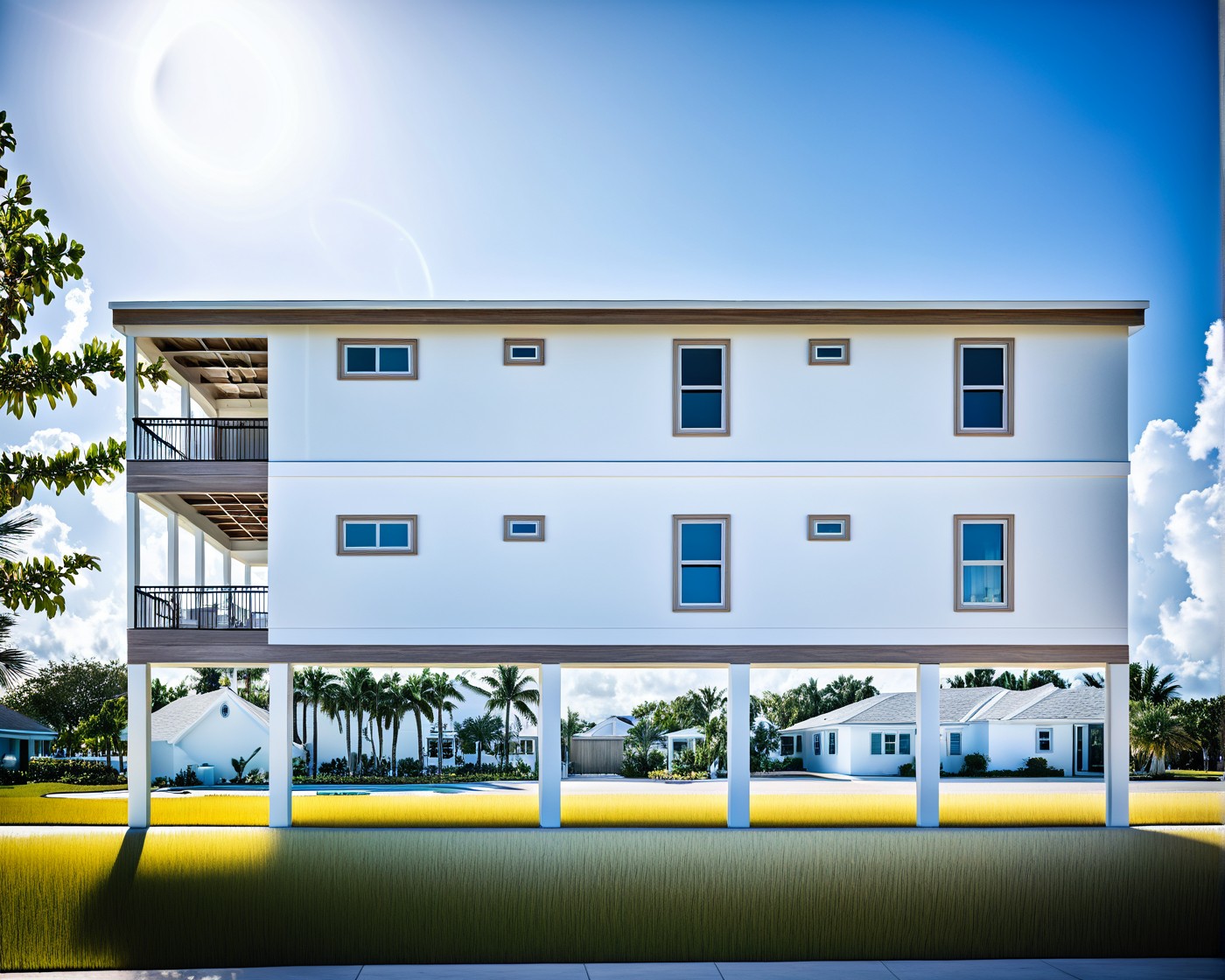A high-resolution photograph of Building, , House with white walls on white stilts in a neighborhood in Florida