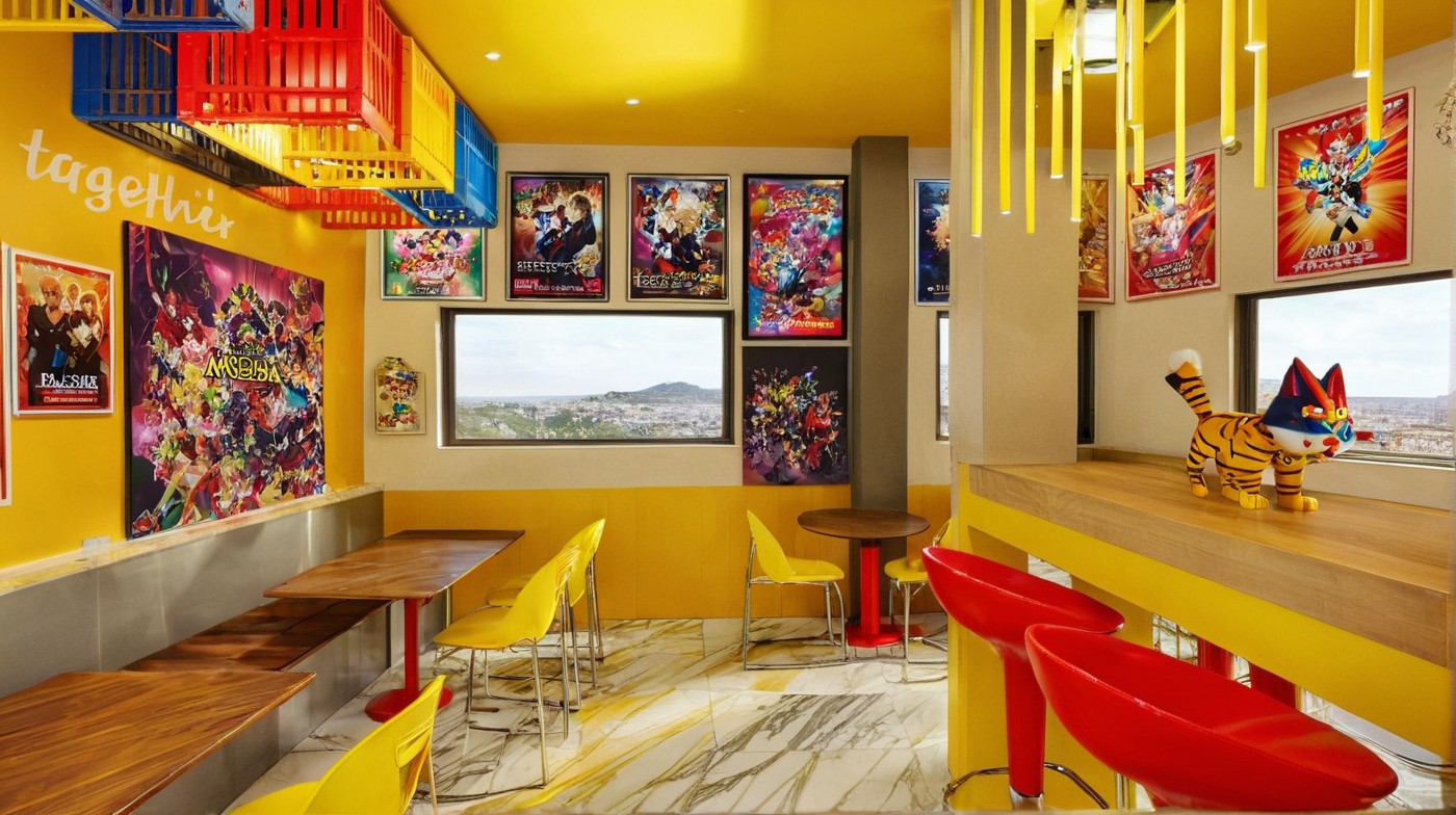 A high-resolution photograph of Cafeteria, , Create a realistic render of this architectural scene. Keep the exact same composition, colors, textures, materials, lighting, and overall mood as in the reference image. Do not modify the design, furniture, or layout — only enhance realism through high-quality reflections, detailed shadows, and natural lighting. The goal is a faithful, photorealistic version of the original image, not a redesign. Maintain the same angle and framing.