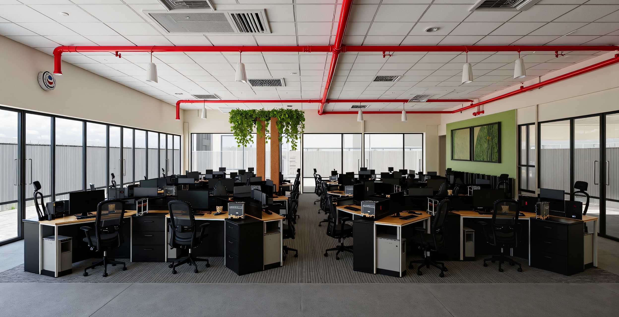 Office, RENDER THIS IMAGE WITH REALISTIC FEELING ,MAKE PLAIN CEILING WITH FAN AND AC WITH HANGING TASK LIGHTS, ALSO ADD SMOKE DETECTOR RED PIPES MAKE IT MORE REALISTIC BRIGHT COLOUR IMAGE