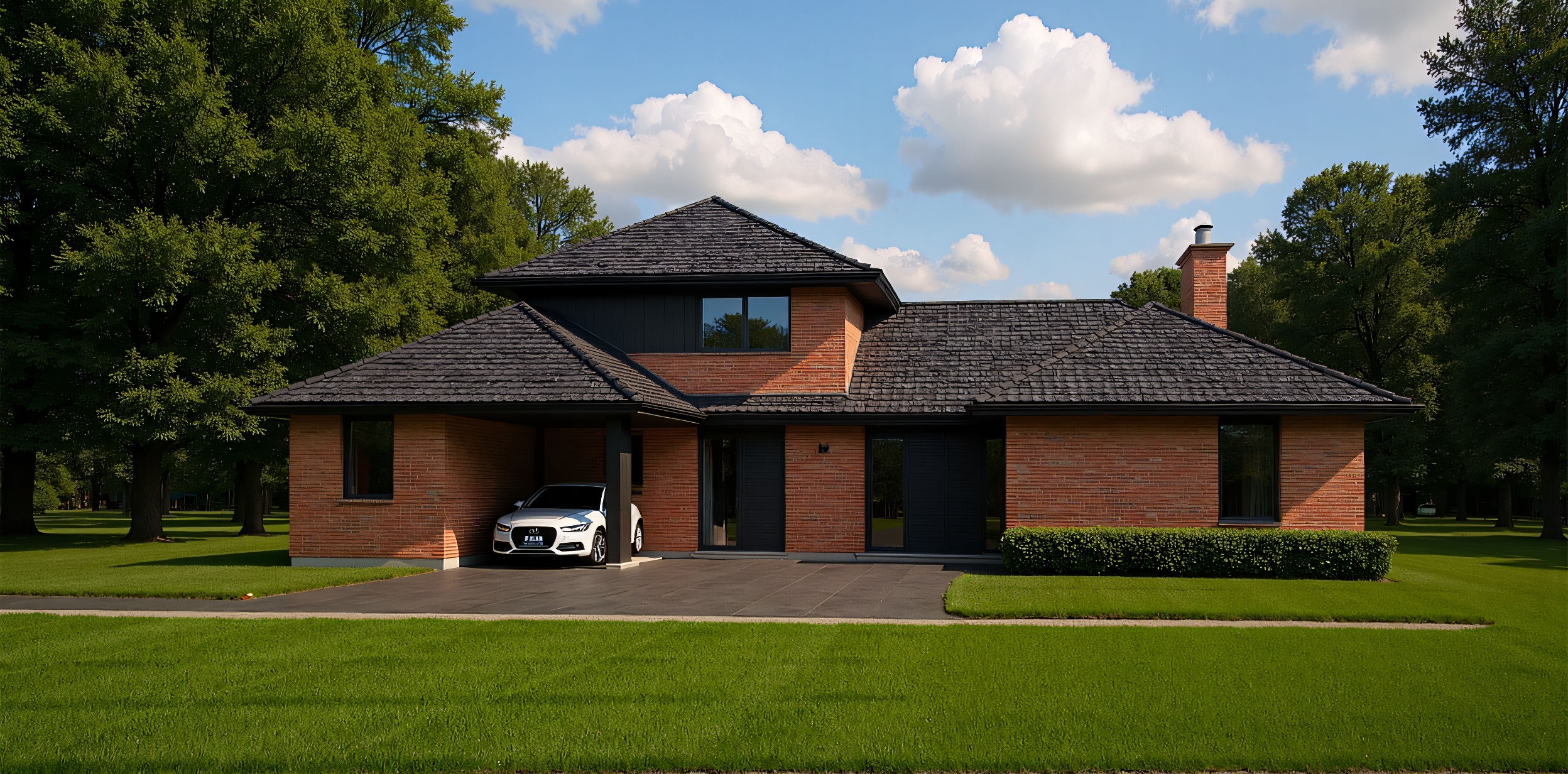 Experience a stunningly realistic 3D model of a red brick residential house, brought to life by ArchiVinci's advanced rendering capabilities. This exterior view showcases a nuanced red brick façade complemented by a sleek black tile roof. Lush, manicured lawns create a welcoming foreground, while mature trees and a dynamic sky with clouds form a picturesque backdrop. The detailed rendering even allows glimpses of interior furnishings through the windows, adding a sense of warmth and occupancy. This bright and inviting image perfectly captures the essence of a dream home, ideal for architectural visualization, real estate marketing, or conceptual design inspiration. ArchiVinci transforms your vision into photorealistic exteriors with ease.
