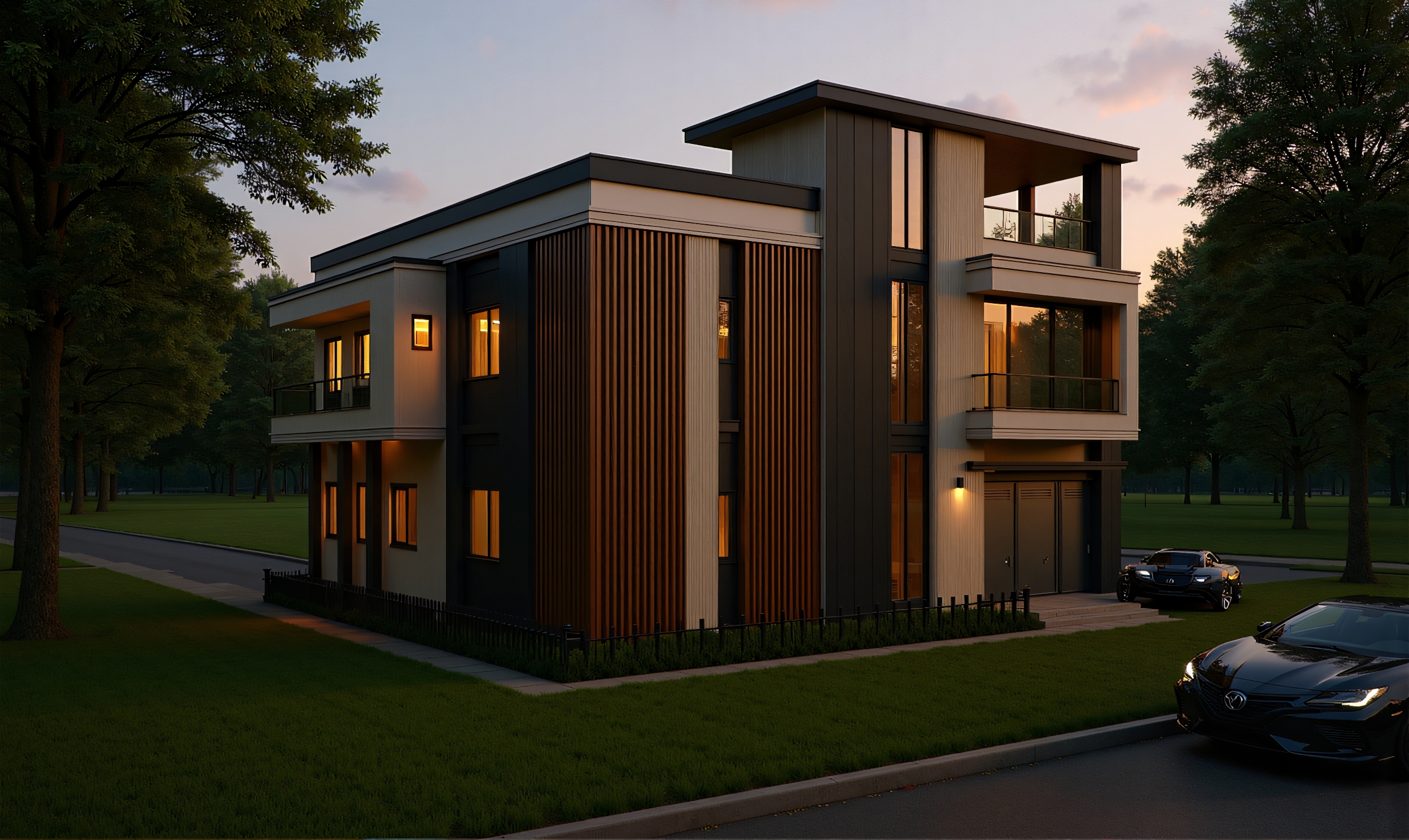Visualize your residential house designs with stunning evening ambiance. ArchiVinci's AI generates photorealistic 3D models, perfect for architectural presentations and marketing. This prompt focuses on creating a realistic exterior scene with a surrounding landscape of grass and trees, illuminated by warm evening light casting dynamic shadows on the building's walls. A moving car adds a touch of life and realism to the environment. Ideal for architects and designers seeking to showcase their projects in a captivating, atmospheric setting, our tool quickly produces high-quality renders that highlight structural details and environmental integration. Explore different lighting scenarios and exterior concepts with ease.