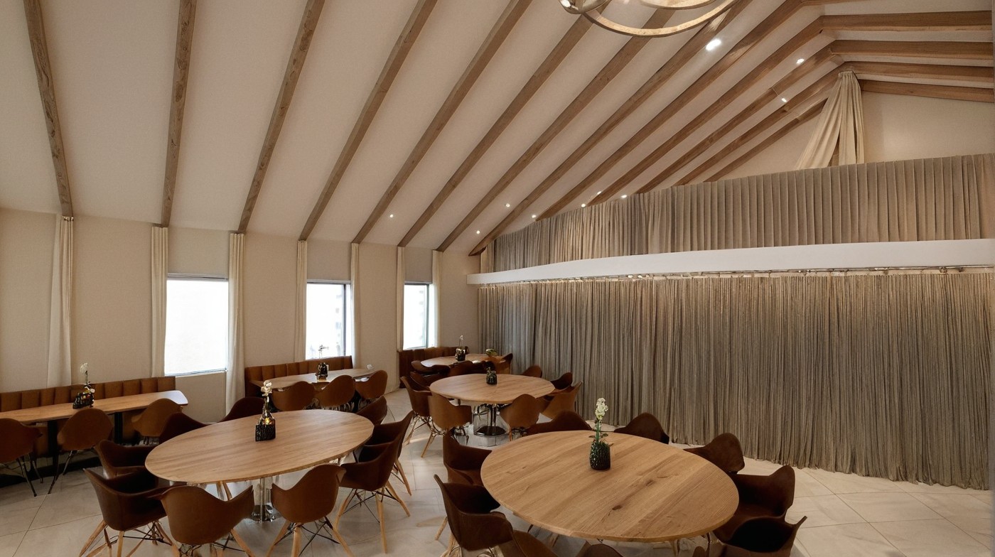 A high-resolution photograph of Restaurant, , white colum, neutral meterial, neutral light, curtain