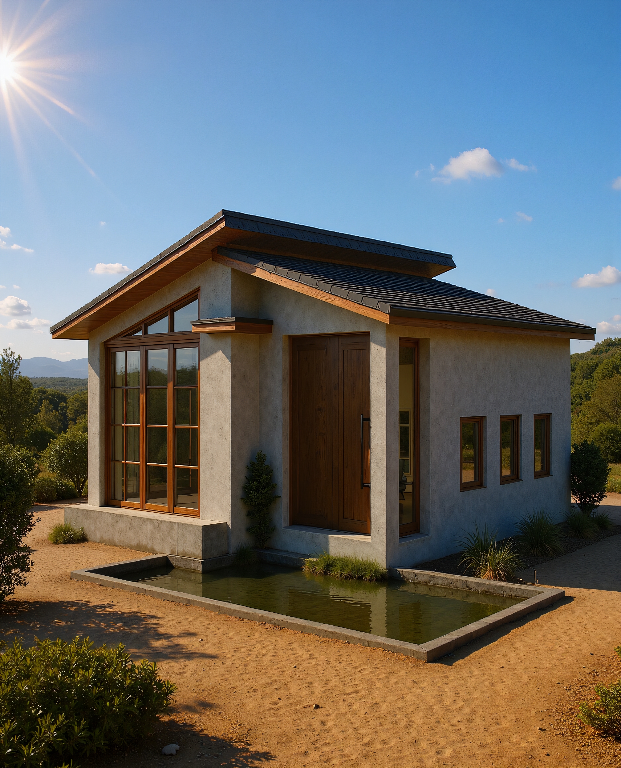 Discover the essence of minimalist Zen with this contemporary villa exterior. ArchiVinci’s AI renders a striking façade of polished concrete and warm dark wood, punctuated by expansive glass panels that mirror the meticulously landscaped surroundings. The design emphasizes clean lines and tranquil negative space, enhanced by integrated water features and geometric, drought-resistant plantings. Soft, indirect lighting highlights the architectural details, creating a serene atmosphere, possibly at dawn or under an overcast sky. This rendering showcases a sophisticated blend of natural materials and minimalist aesthetics, perfect for creating a peaceful, modern retreat. ArchiVinci enables rapid visualization of such refined architectural concepts.